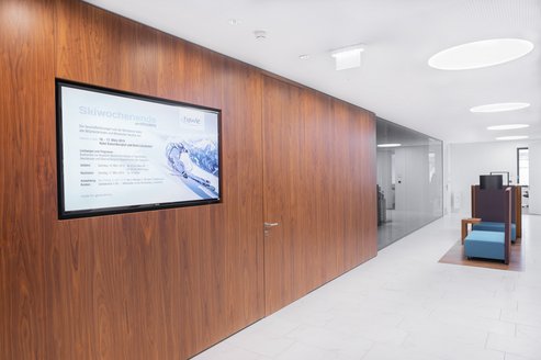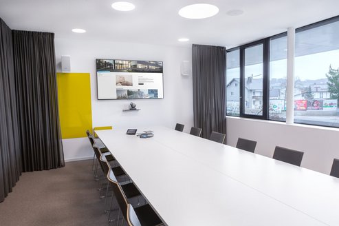 Die gemeinsame Zielsetzung war es, eine einfache und intuitive Konferenzraumtechnik für die zahlreichen Besprechungsräume in die Praxis umzusetzen und darüber hinaus eine möglichst einfache Bedienung zu ermöglichen. Auch sollten die Mitarbeiter sowie externe Gäste über die laufenden Neuigkeiten des Unternehmens informiert werden. Dazu wurde ein flächendeckendes digitales Informationsleitsystem (Digital Signage) umgesetzt, welches zeitgesteuert durch das zentrale Marketing des Unternehmens mit ausführlichen Information bespielt wird.