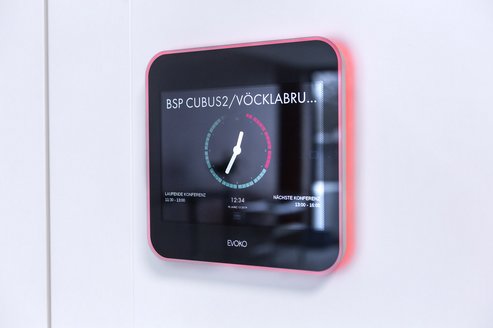 Um den Mitarbeitern eine effiziente und termingerechte Raumnutzung zu ermöglichen, durften wir eine Microsoft Exchange integrierte Raumbuchungslösung realisieren. Diese Lösung besteht aus einem Touch-Display, das außerhalb eines Besprechungsraums angebracht wird und über gebuchte Besprechungen im betreffenden Raum informiert. Über Microsoft Outlook generierte Termine werden automatisiert an das System gesendet und angezeigt. Zudem lassen sich neue Einträge auch simpel direkt über das Touch-Display vor dem jeweiligen Besprechungsraum durchführen.