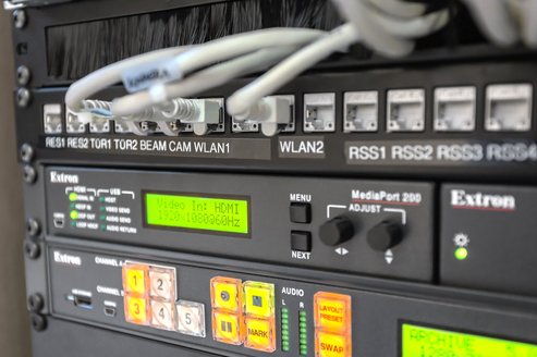 Auch auf das wichtige Thema „Streaming“ wurde nicht vergessen. Der Extron SMP 351 ist ein professioneller Aufnahme- und Streaming-Prozessor zur Erfassung und Verteilung von AV‑Quellen und ‑Präsentationen. Die Inhalte können auf verschiedenen Speichermedien aufgezeichnet, live ins Web sowie in andere Hörsäle am Campus gestreamt werden.